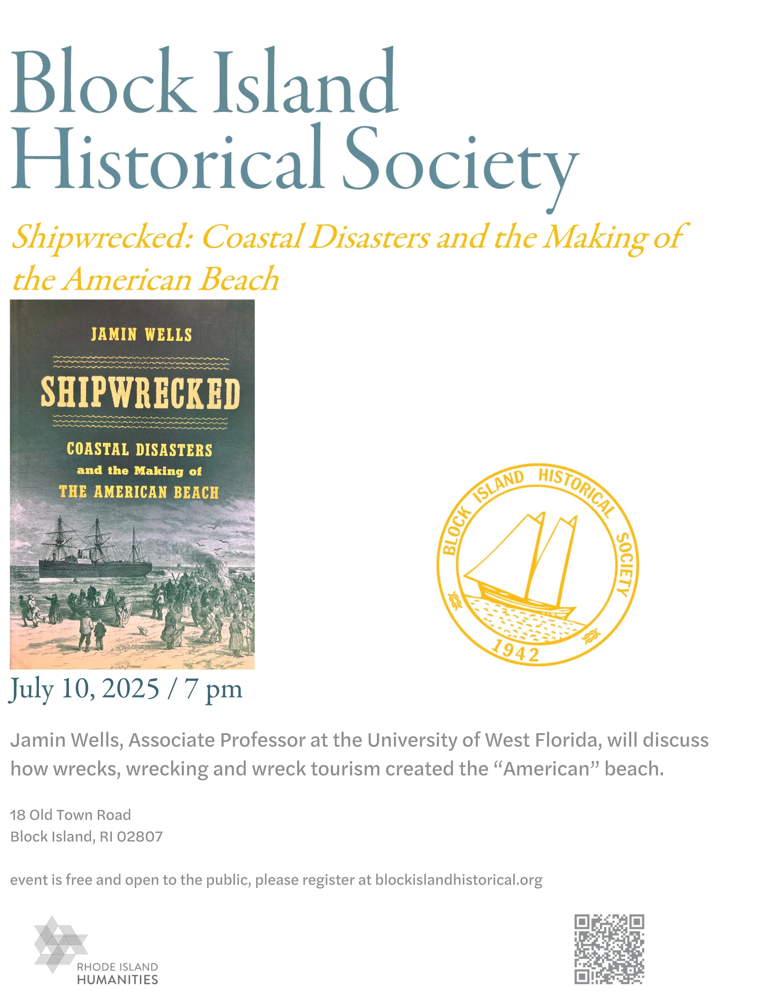 Shipwrecked: Coastal Disasters and the Making of the American Beach Thursday, July 10, 2025 7:00 PM 8:15 PM Google Calendar ICS Author of Shipwrecked: Coastal Disasters and the Making of the American Beach, Jamin Wells, will discuss how wrecks, wrecking, and wreck tourism created the “beach” as we know it.